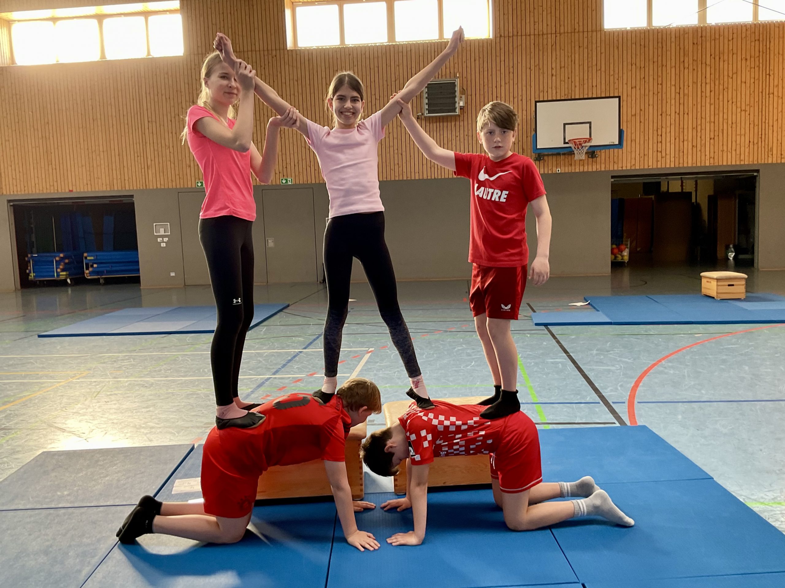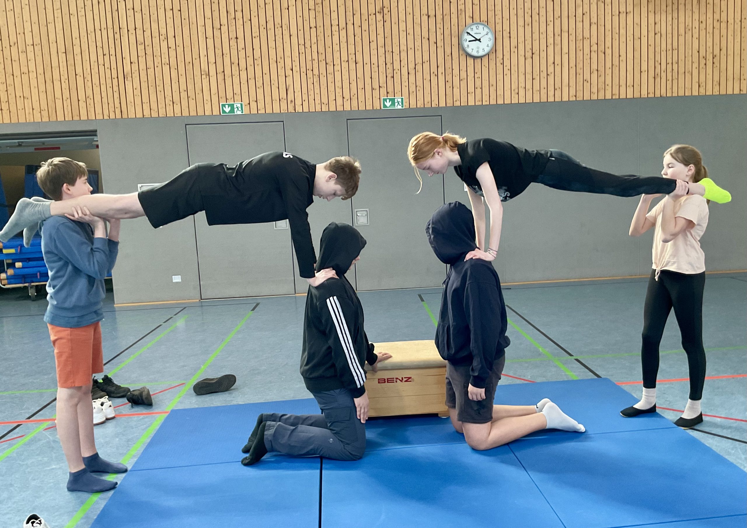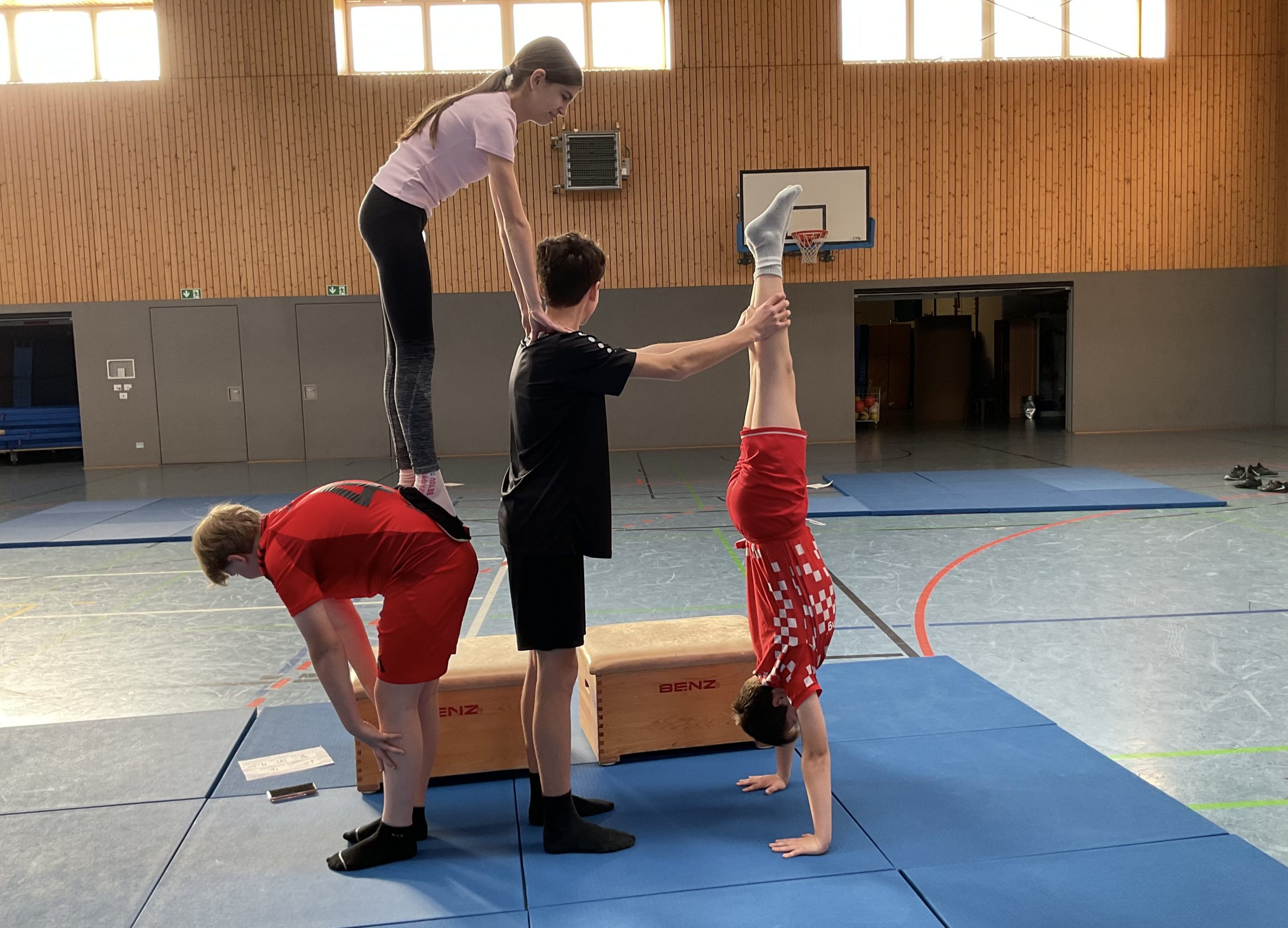 Die Klasse 7d hat sich in den vergangenen Wochen im Sportunterricht im Themenbereich Akrobatik mit dem Pyramidenbau beschäftigt. In dieser Unterrichtseinheit standen neben Bewegung und Körperspannung vor allem Teamarbeit und gegenseitige Unterstützung im Mittelpunkt.