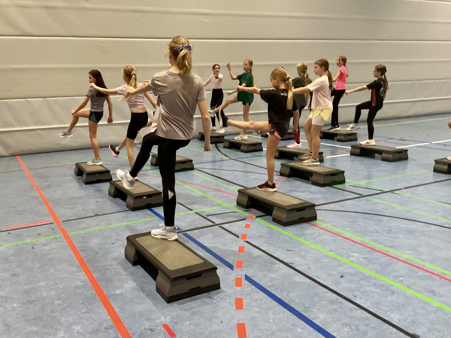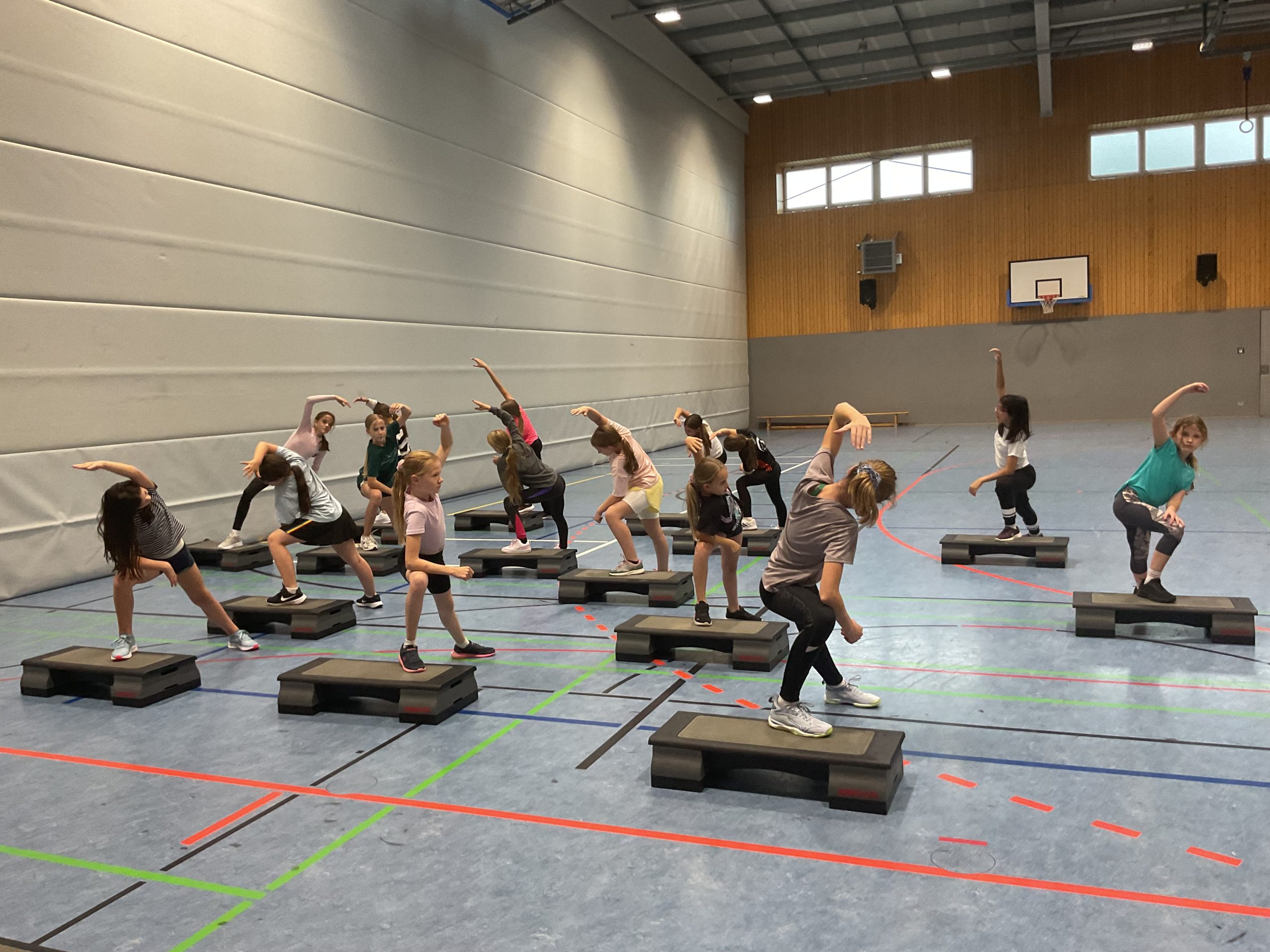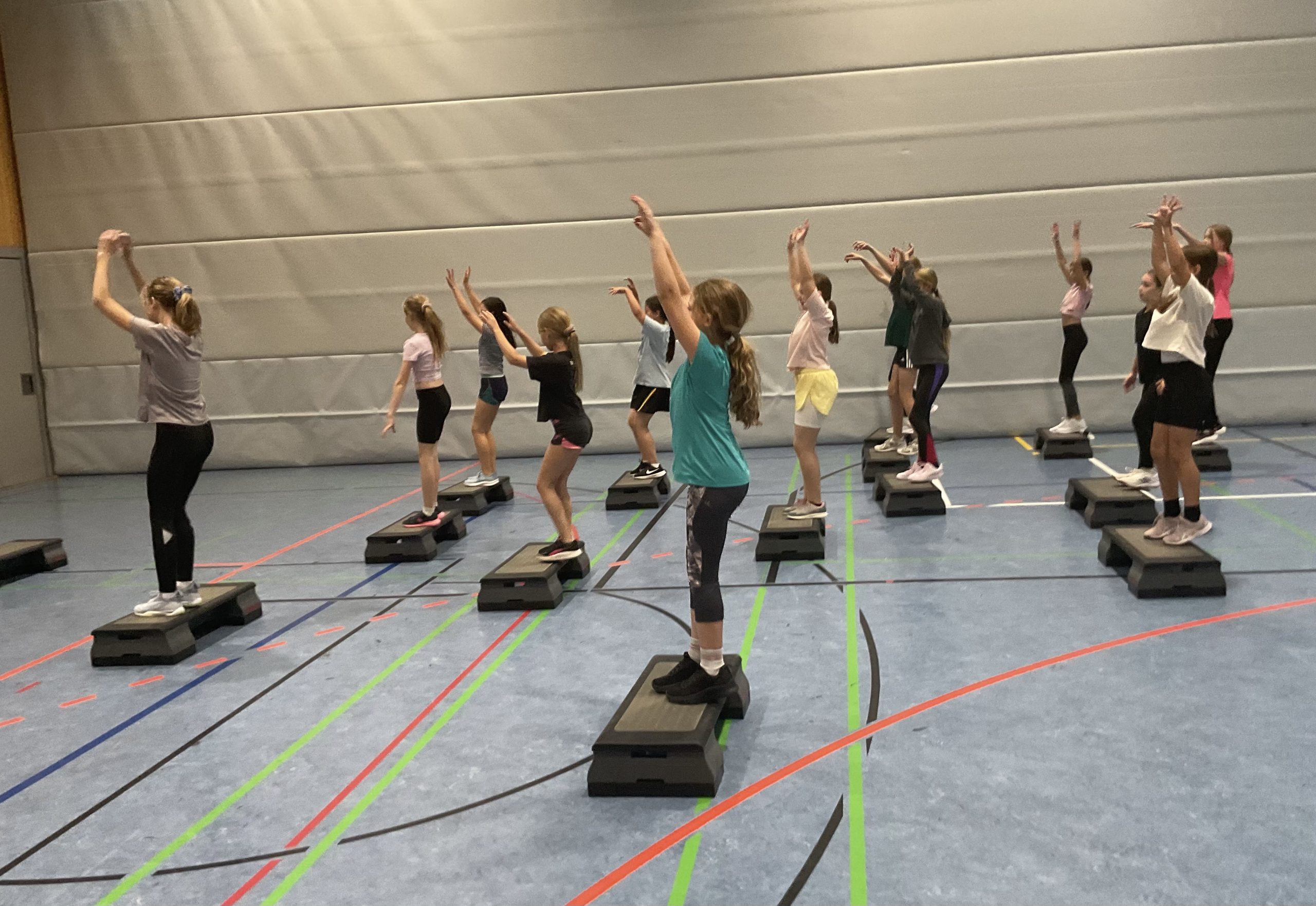 Rhythmische Musik ist zu hören, 16 Schülerinnen bewegen sich gemeinsam im Takt auf ihren Steppern auf und ab. Schweißtreibend, konzentriert und mit viel Energie findet die StepAerobic/Fitness-AG statt.