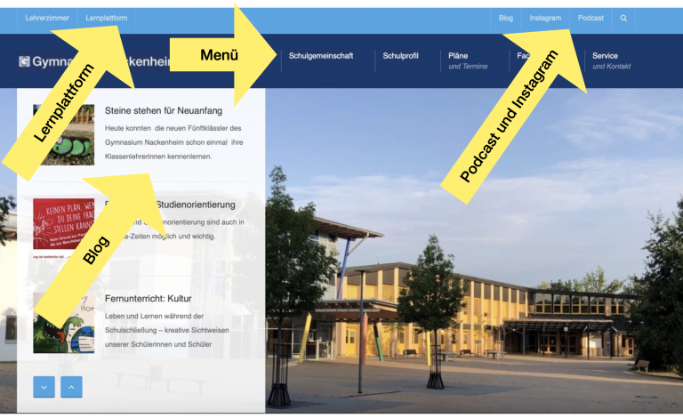 Die obere Zeile des Kopfes erscheint in hellem Blau. Hier finden sich auf der rechten Seite unsere Kanäle, in denen wir mit allen Interessierten kommunizieren wollen. Im Blog sammeln wir alle unten gezeigten Artikel. Instagram bietet uns die Möglichkeit das Schulleben tagesaktuell zu begleiten. Schüler, Eltern, Ehemalige und Interessierte finden hier Neues und Spannendes aus dem Schulalltag. Der Podcast ist das neueste Element unserer Social Media Auftritte. Hier möchten wir in kurzen Episoden über verschiedene Themen sprechen. Wir freuen uns, über Feedback, Wünsche für Sendungen sowie Ideen für eigene Beiträge.
